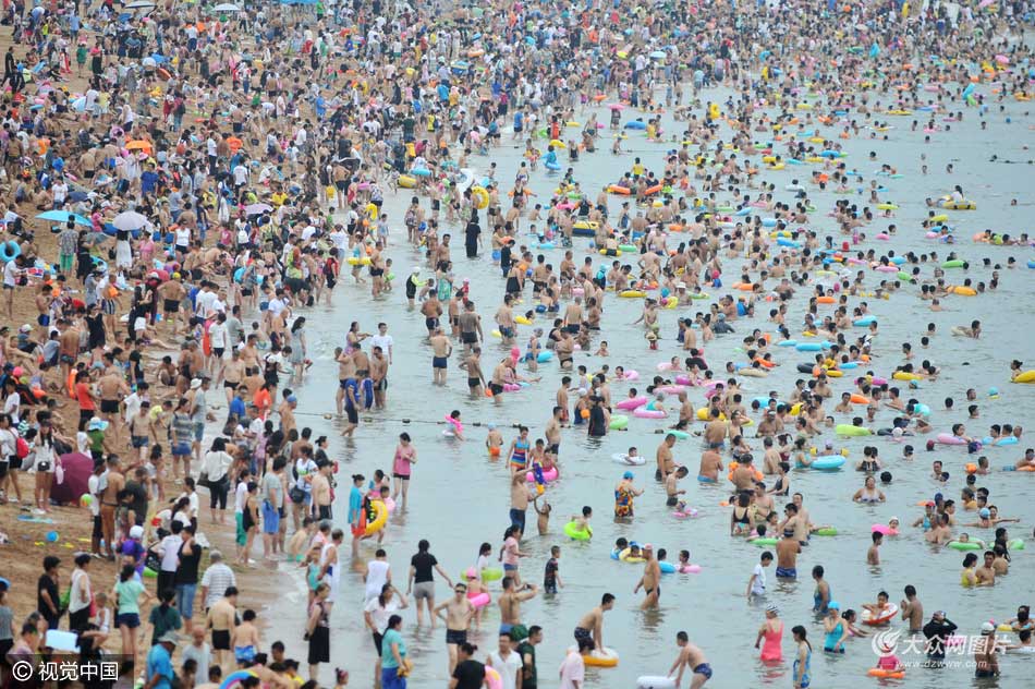 2016年8月21日,山東省青島市,受炎熱高溫天氣影響,各大海水浴場爆棚,游客扎堆下海納涼如同“下餃子”。