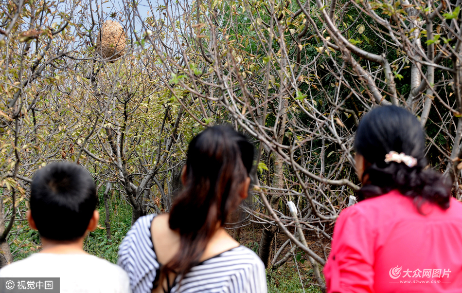 昨日,華商報(bào)記者在藍(lán)田縣三里鎮(zhèn)柳家村旁的一個(gè)櫻桃園里找見了這個(gè)蜂窩。蜂窩筑在一棵大櫻桃樹的樹枝上,呈紡錘形掛下來,垂直方向直徑差不多已超過了一米,不時(shí)有小拇指大小的胡蜂飛進(jìn)飛出,甚是嚇人。