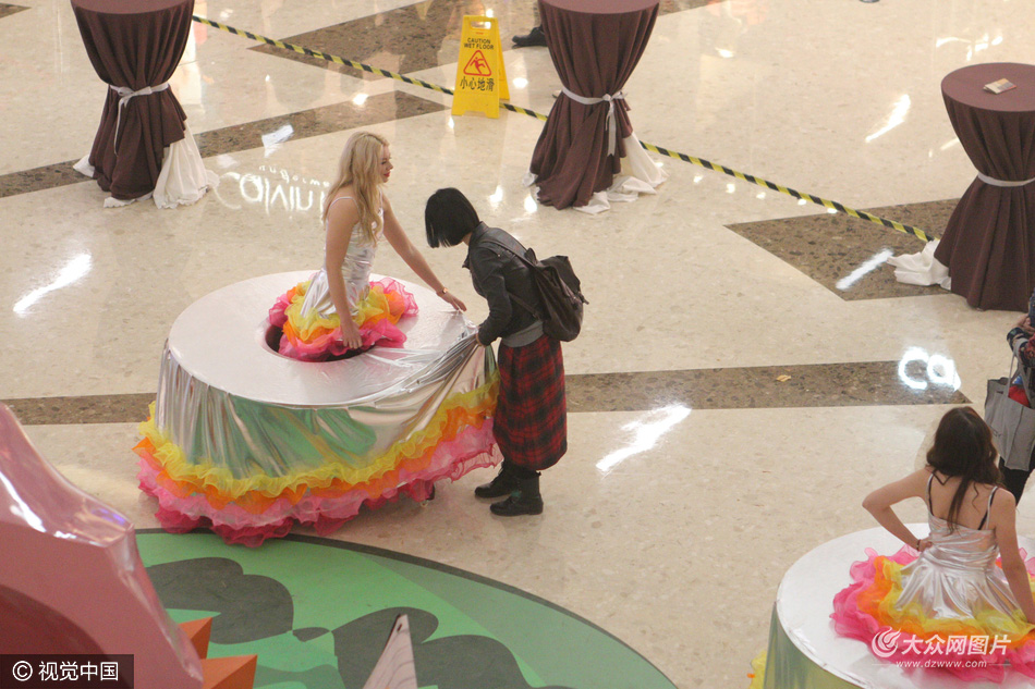 2016年11月5日,山東省淄博市,一商家聘請兩位漂亮的洋模特裝扮成“芭比娃娃”蛋糕站在商場大廳。起初,這兩個巨型“蛋糕”一動不動,每當有市民從身邊路過時就突然招手示意,令市民先是大吃一驚,而后開心大笑,周圍市民被這一“惡作劇”逗樂,紛紛圍觀“芭比娃娃蛋糕”并用手機拍照。