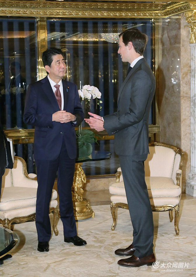 當(dāng)?shù)貢r(shí)間2016年11月17日,美國(guó)紐約,日本首相安倍晉三跟美國(guó)候任總統(tǒng)特朗普的女兒伊萬(wàn)卡夫婦交談。