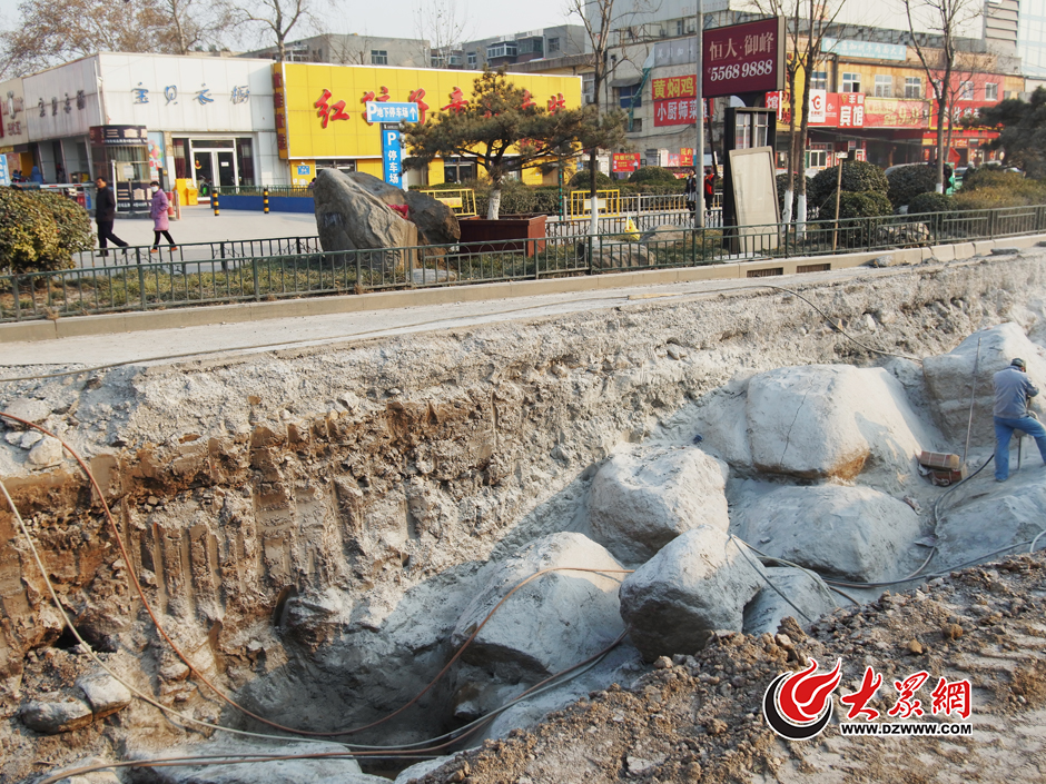 近日,有不少市民質疑濟南濟濼路大修為何要對狗屎山山體進行破拆?12月8日下午,大眾網記者在濟南動物園對面馬路東邊的綠化帶看到,有一座高一米多、寬三四米的小石頭山,附近的市民介紹,這里就是狗屎山。記者在施工現場看到,在緊挨著狗屎山的一側馬路上,路面被挖開一道巨大的深坑,寬十幾米,綿延數公里。而就在緊挨狗屎山的深坑處,數組巨大的山石靜立其中,最高者達三四米,連連綿近十米。圖為工人對狗屎山進行破拆。