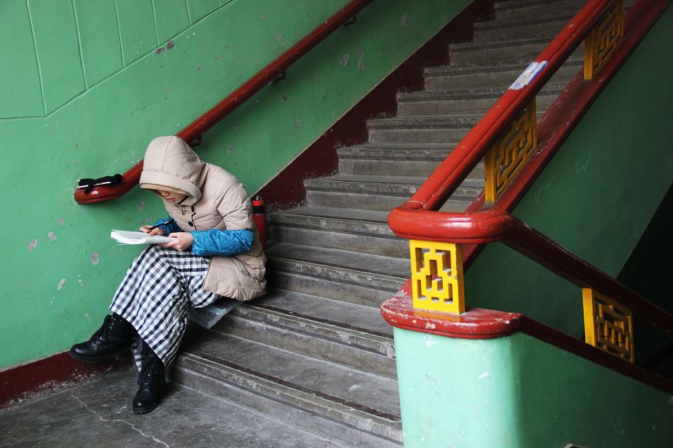 12月20日,山東師范大學二號教學樓樓梯口,室內(nèi)溫度1度,學生在腿上裹上小被子爭分奪秒備戰(zhàn)考試。實習生 孫明悅攝