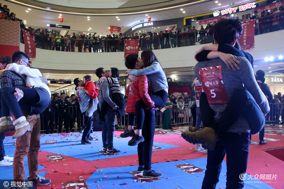 當日,山東濱州舉行情人節接吻大賽,冠軍將獲得價值8000元的鉆戒,這一巨獎吸引了多對情侶參賽。想要獲得最終冠軍,情侶們要接連闖過五關。圖為情侶們在第一關“愛之吻”比賽中。這一關中情侶雙方立正以正常方式接吻,雙嘴分開則淘汰,限時五分鐘,挑戰成功者進入下一關。新奇的接吻大賽吸引了很多市民圍觀,他們紛紛掏出手機拍照。接吻比賽現場,整個商場三層樓都圍滿了看熱鬧的市民。