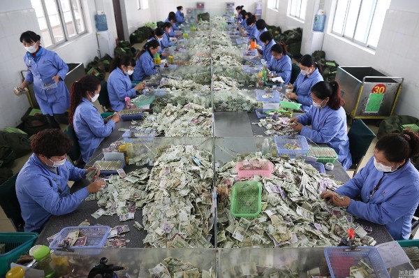 2017年02月15日,云南省昆明市,數(shù)錢(qián)按理來(lái)說(shuō)應(yīng)該是件幸福的事,可如果每天都要清點(diǎn)上萬(wàn)元1毛到1元不等的零錢(qián),同事之間還沒(méi)有閑談的時(shí)間,那估計(jì)沒(méi)人覺(jué)得是件很幸福的事了。昆明公交公司的“點(diǎn)鈔員”做的就是這樣日復(fù)一日、年復(fù)一年清分、清點(diǎn)零錢(qián)的工作。每天要點(diǎn)上萬(wàn)零錢(qián)。圖/視覺(jué)中國(guó)