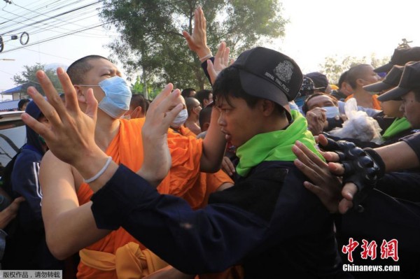 當(dāng)?shù)貢r(shí)間2月20日,泰國(guó)警察管控法身寺,欲逮捕涉嫌洗錢的主持。在寺廟外,眾多僧侶與警察對(duì)峙。警察要求法身寺僧人暫時(shí)離開寺廟,以搜查曾為寺廟主持的逃犯,該廟僧人拒絕離開并與警察發(fā)生沖突。