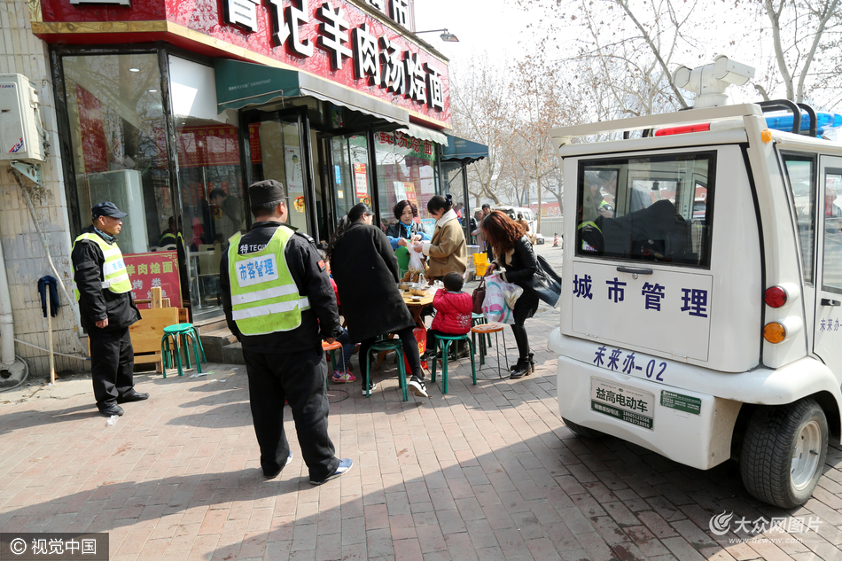 2017年2月19日,鄭州,在緯五路一家飯店門前,有幾個大人帶著小孩在外面的桌子上吃飯。雖然屬于占道經營,但城管并沒有著急上前讓收桌子,而是站在一旁,等吃完飯才催促店主收攤。