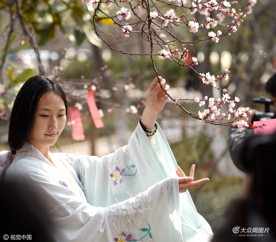 03月12日,氣溫接近0℃,50多位漢服愛好者來到泉城公園,身穿著漢服踏青游園,祭花神,誦詩賞花,迎接中華民族傳統節日里頗具浪漫色彩的花朝節。這些女孩均是大學生或是高中生,因為喜歡漢服韻味而相聚一堂,女生盤起長發戴上各色仿古發飾,用獨特的方式迎接花朝節。