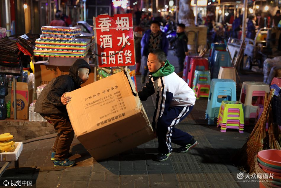13歲的張俊和9歲大的弟弟張合海放學(xué)寫完作業(yè)后,一直在忙著幫父母干活。他們的父母在東城路開了一個小百貨店,主要經(jīng)營酒水、香煙和日用品。然而,隨著夜市上做小生意的人越來越多、顧客需求的商品在很多攤位上都能找到,小店的生意越來越難做。按小哥倆母親的說法,這兩年,店里每個月掙的錢僅夠全家人吃喝。常亮/視覺中國