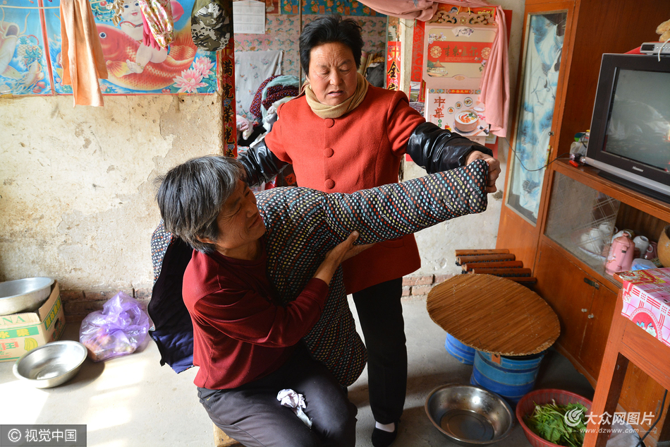 呂存珍的鄰居管仁臻(后)正在幫助她穿上衣。呂存珍說,這么多年,很多好心的鄰居和親友,以及村委一直在都幫助她,讓她很感激。這些年她是在過著“鄰居的日子”(意思是:鄰居在生產(chǎn)、生活中的幫助)。