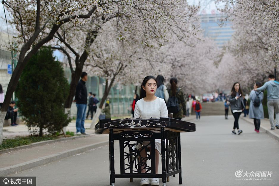 3月19日,大學最美景觀長廊花海綻放,美女學生花下撫琴意境醉人。
