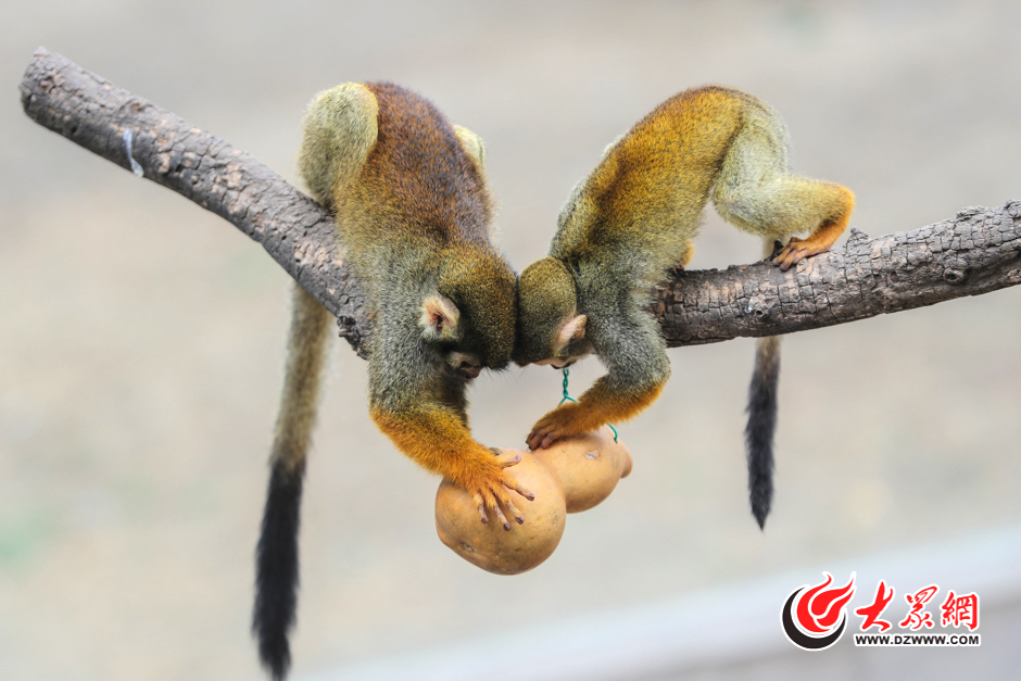 3月23日,在濟南動物園里,動物們一直過著食住無憂的生活,為了讓它們不覺得無聊,提高幸福指數,園方為動物們量身定制了“豐容玩具”。圖為兩只松鼠猴在爭奪葫蘆里的美食。大眾網記者 王長坤 攝