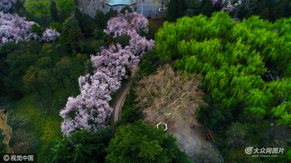 2017年03月24日,山東省濟南市,百花公園里姹紫嫣紅,粉色的紫葉李、白色的玉蘭花、玫紅色的美人梅競相開放,從百米高空俯瞰,艷麗的花朵與綠樹相伴,絢麗如同調色板。
