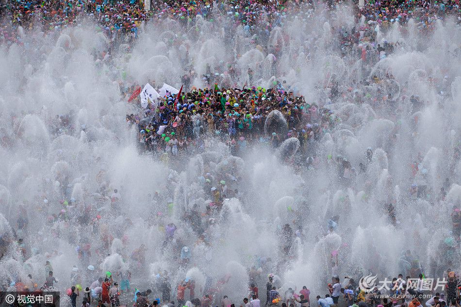 2017年4月15日,人們在西雙版納景洪潑水廣場參加潑水狂歡。 當日,一年一度的萬人潑水狂歡在云南西雙版納景洪市舉行,數萬名當地群眾和游客共同狂歡。 段健/視覺中國