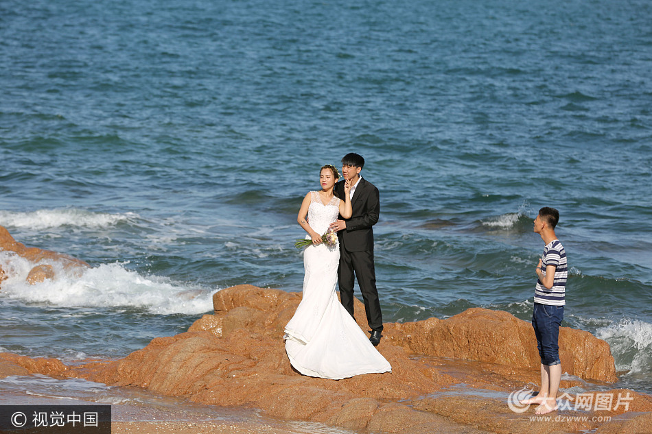 2017年5月25日,新人在青島海濱拍攝婚紗照。