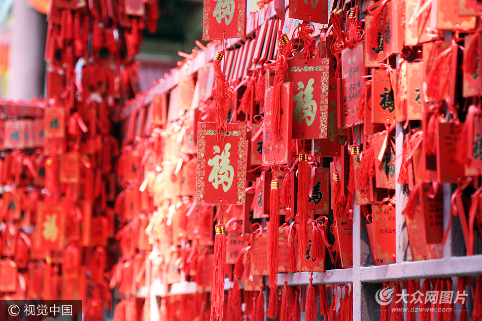 2017年5月28日,在山東泰安岱廟內(nèi)一大典前,兩側(cè)約30米長(zhǎng)的紅色欄桿上,密密麻麻的掛滿了游人祈福用的紅色福字木牌,木牌的背面寫滿了祝福的短語。臨近端午,不少游人特意選擇來岱廟寫福牌,祈福牌成為岱廟內(nèi)一道亮麗風(fēng)景線。