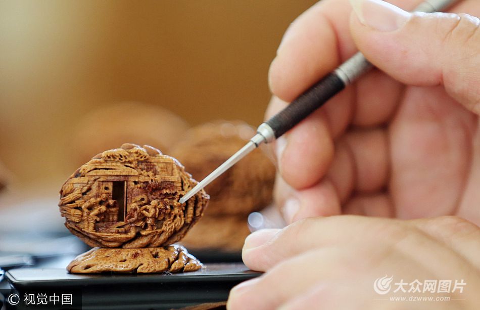 2017年5月30日,山東濰坊青年核雕師田洪波正在創作《憶童年》核雕作品。日前,山東濰坊青年核雕師田洪波歷時三年多時間創作的《憶童年》核雕作品亮相,此核雕作品共十二件,采用立體圓雕、浮雕、鏤空相結合,丟沙包、斗蟋蟀、玩彈球、捉迷藏等70、80年代兒時的游戲栩栩如生的在核雕作品上展示,充分體現了時代感,喚起了人們對兒時的記憶。