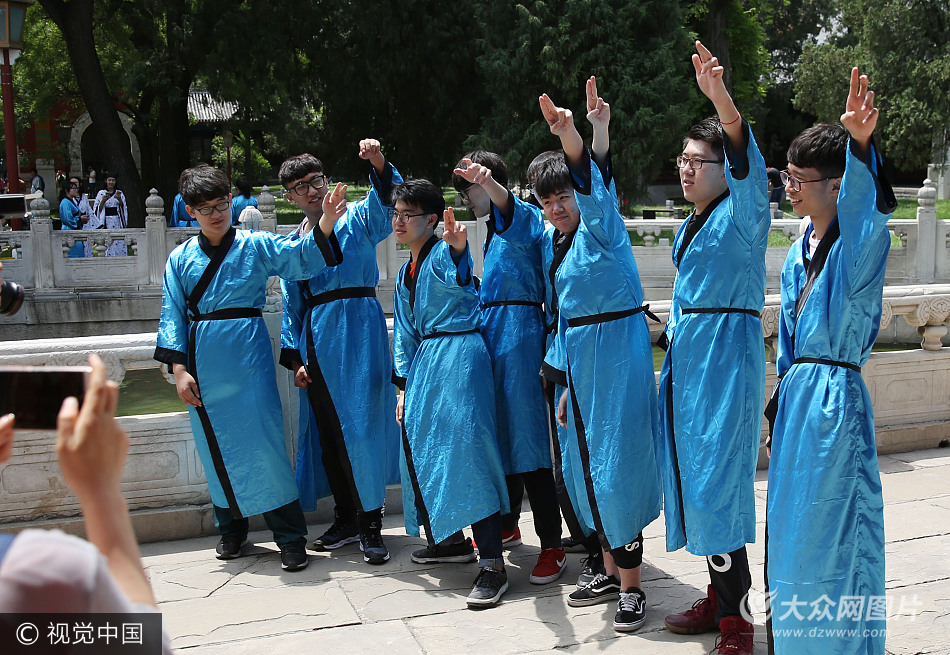 2017年6月2日,北京,高考前夕,北京的一所中學數十名高三學生身穿漢服和老師、家長,一起在北京孔廟和國子監博物館舉行成人禮,共慶成年,步入人生新起點。