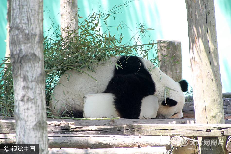 2017年6月15日,山東榮成,這兩天,在西霞口野生動物自然保護區,為應對高溫天氣,不耐炎熱的大熊貓,趴在空中涼棚里,沐浴著海風,抱著冰塊上玩耍、睡覺,憨態可掬,萌噠噠超可愛,惹得游人歡喜倍至。