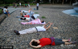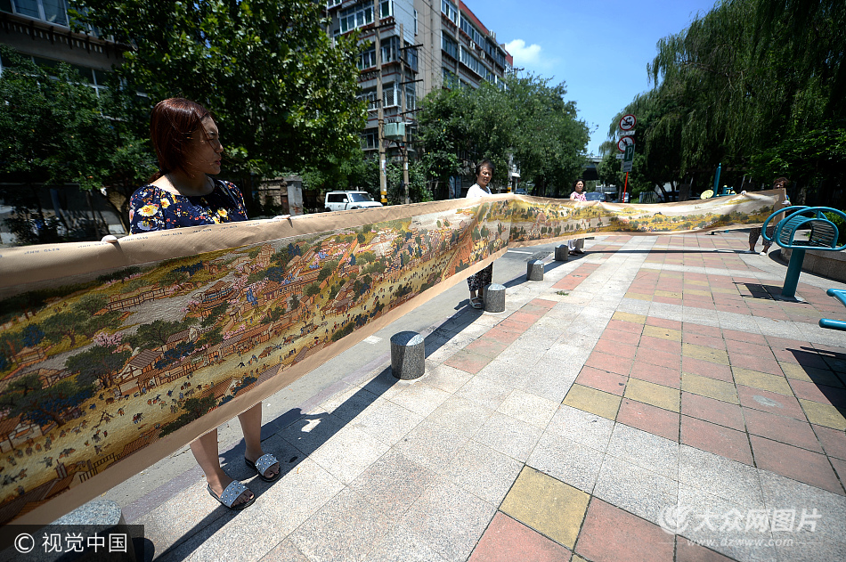 2017年7月20日,濟南,家住啟盛街的退休職工解建華和鄰居們一起,展示自己歷經五年刺繡而成的《清明上河圖》。