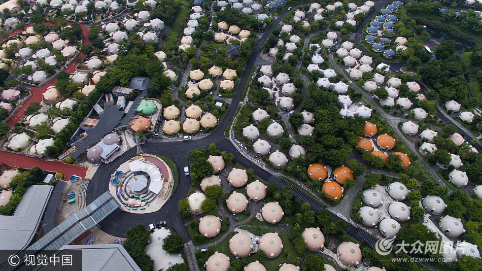 當地時間2017年7月31日,日本熊本縣,阿蘇農場抗震圓頂屋鳥瞰圖。阿蘇農場位于阿蘇國立公園內,在海拔550米的農場占地面積達到了2000坪,是全世界獨有的大自然主題公園。而農場里最具特色的便是形狀奇異且連綿成群的“饅頭屋”,它們不僅是提供給來到農場游客的獨棟小別墅,也為地震災民提供避難所 。