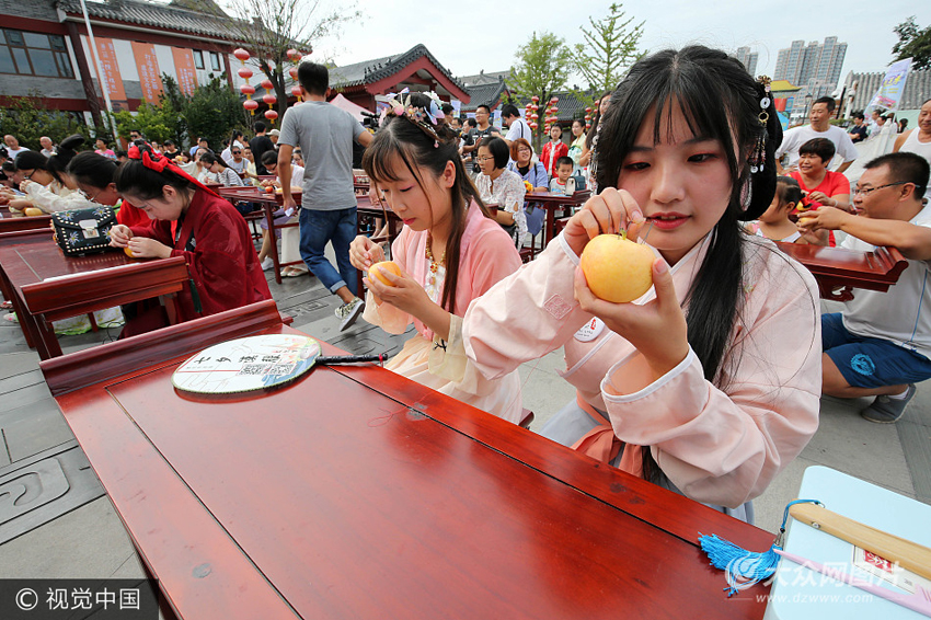8月27日,濰坊市,漢服愛好者正在參加“穿針引線”活動(dòng)。當(dāng)日,濰坊市舉辦了一場(chǎng)“七夕漢服文化”活動(dòng),來自濰坊市區(qū)的數(shù)十名漢服愛好者身著長(zhǎng)裙寬袖的古代服飾,開展進(jìn)行女子穿針、浮針、繡香囊,用傳統(tǒng)習(xí)俗、古典歌舞,讓市民欣賞中國(guó)傳統(tǒng)“七夕”的文化。
