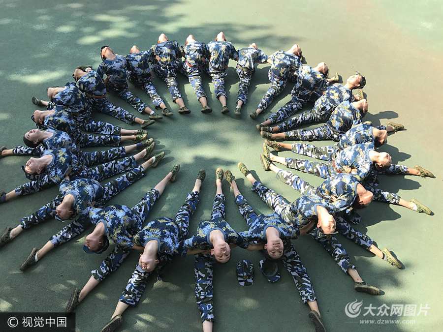 2017年9月7日,濟南,在山東師范大學千佛山校區的新生軍訓場地,千余名2017級新生們開始軍訓。音樂學院舞蹈專業的十幾名女生利用休息時間,相互比拼舞蹈技能,向師生展示一字馬、大跳等優美舞姿,為軍訓生活增添一份活力。