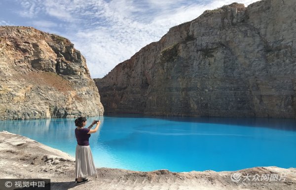 山東濰坊現“藍色水域” 引路人拍照
