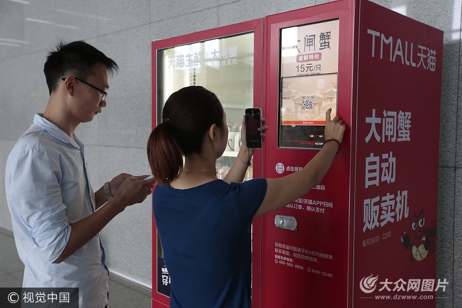 2017年9月27日,上海,一臺大閘蟹自動販賣機出現在上海長寧路一寫字樓底層,引發市民白領圍觀。這臺大閘蟹自動販賣的外形和其他的飲料等販賣機差不多,只售賣陽澄湖大閘蟹。每一只大閘蟹都裝在一個透明的圓形被子里,販賣機分為五層,每層大概放置了15只陽澄湖大閘蟹。售賣機上標明的價格是15元一只,比市場價格便宜不少。消費者只要通過手機掃販賣機液晶屏幕上的二維碼即可完成支付,即可購買。