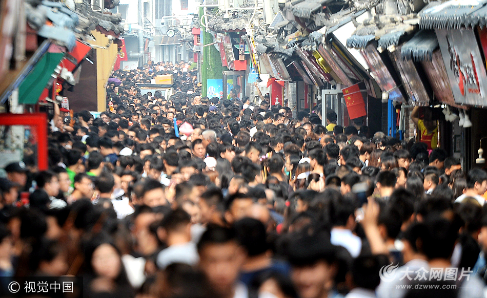 2017年10月1日,山東省濟南市,匯聚各地美食的老城區芙蓉街,300米長的老街人山人海,從高處眺望整條老街擠滿了游客。據了解,芙蓉街內約有百余家經營小吃餐飲的餐館,國慶假期吸引眾多“吃貨”前來,每天接待游客數量達到數萬人。