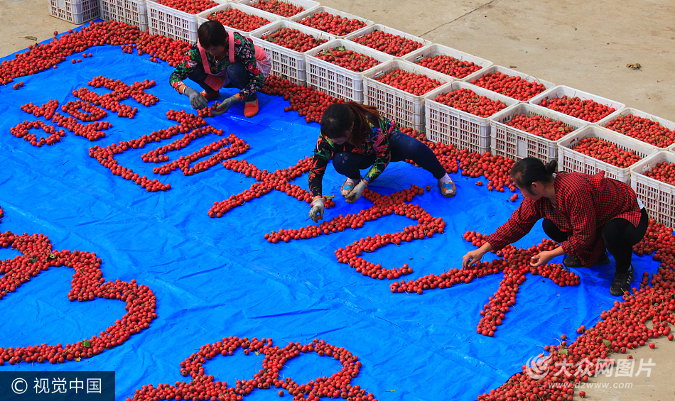 2017年10月16日,山東省臨沂市平邑縣利溝村奇宏果品專業合作社的社員們在用收獲的山楂拼寫喜迎十九大。
