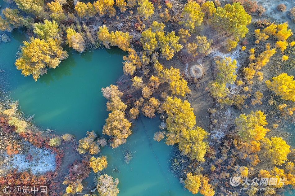2017年10月22日,記者在新疆生產建設兵團二師33團葫蘆島景區航拍的塔里木河兩岸成片金黃色的胡楊十分壯觀。