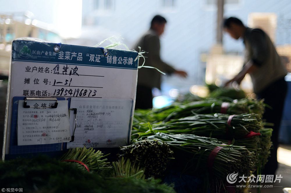 2017年10月31日,山東省濟南市,在濟齊路附近匡山蔬菜批發市場,數家批發韭菜的攤位前都懸掛上“韭菜產品雙證銷售公示牌”,張貼了“合格證”和“山東省食用農產品市場銷售憑證”,同時還注明了批發韭菜的業主姓名和聯系電話。