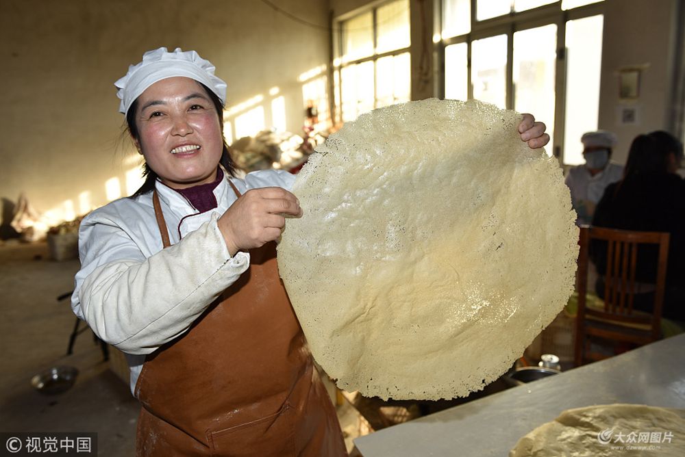 2017年11月26日,在山東省日照市五蓮縣前魏家村,今年46歲的高月逢在展示剛剛用地瓜做出的煎餅。從去年開始,她和幾個姊妹們用地瓜做煎餅,只干3個月就能賣16萬元。