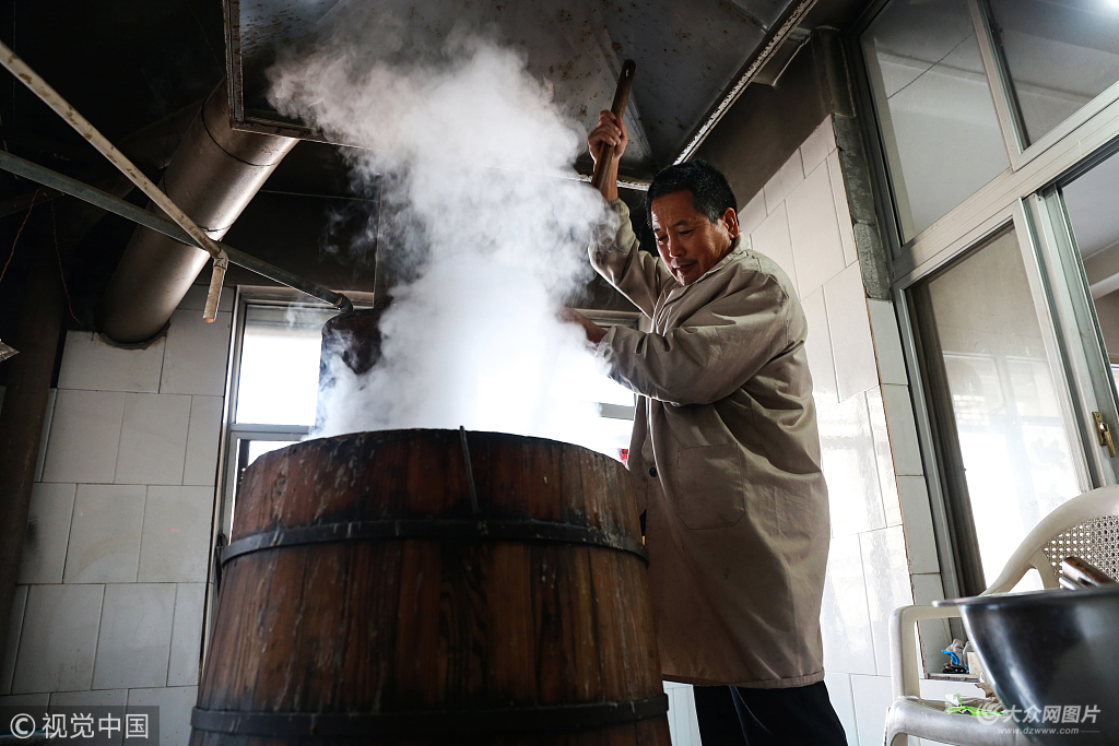 2017年11月26日,山東臨沂,劉朝明,從八零年開糝鋪距現在已快四十個年頭,九零年以前每碗兩毛錢一碗,現在要兩塊錢一碗,沖上雞蛋的三塊一碗。他說一鍋糝能出1200碗,早上四點開始不到八點半就賣光了。
