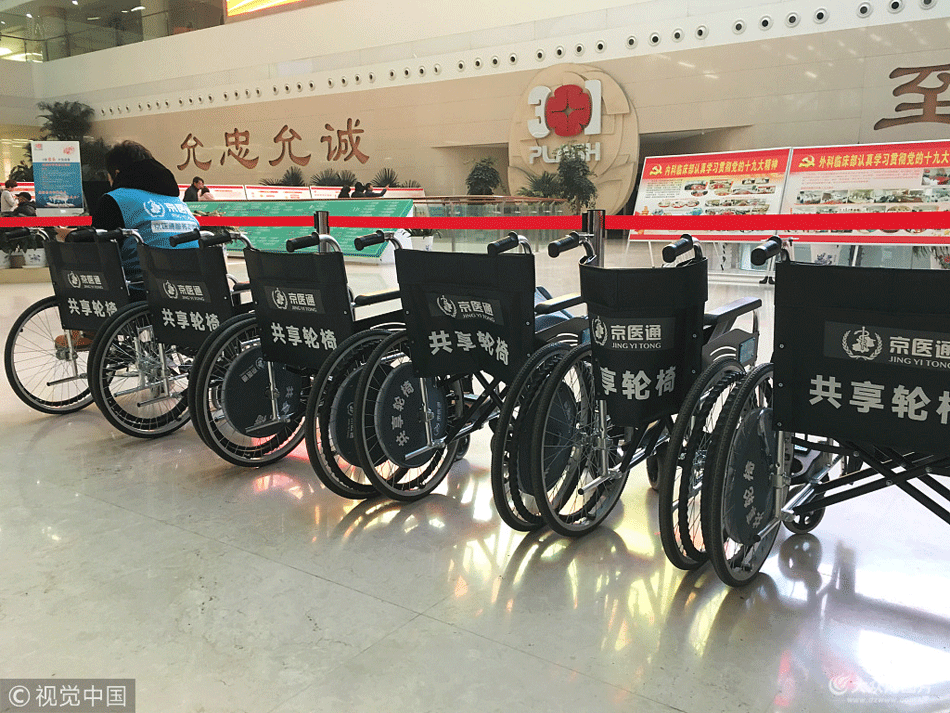 2017年12月2日,北京,在解放軍301醫院門診樓一層北門避風閣以及西門避風閣內(24小時),20輛左右共享輪椅隨時為患者提供院內服務。