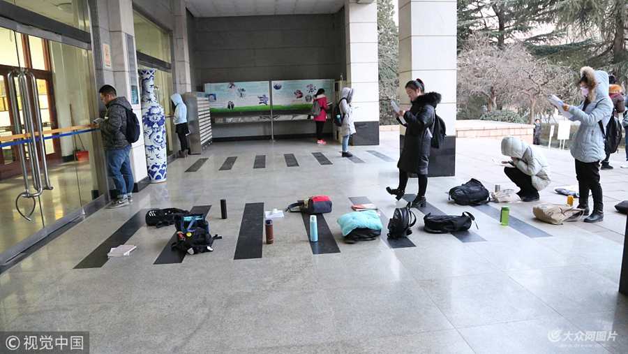 2018年1月9日,在濟(jì)南一高校校園圖書館大門口,大學(xué)生備戰(zhàn)期末考試,在圖書館門口用杯子、書包、考試資料排隊占位。