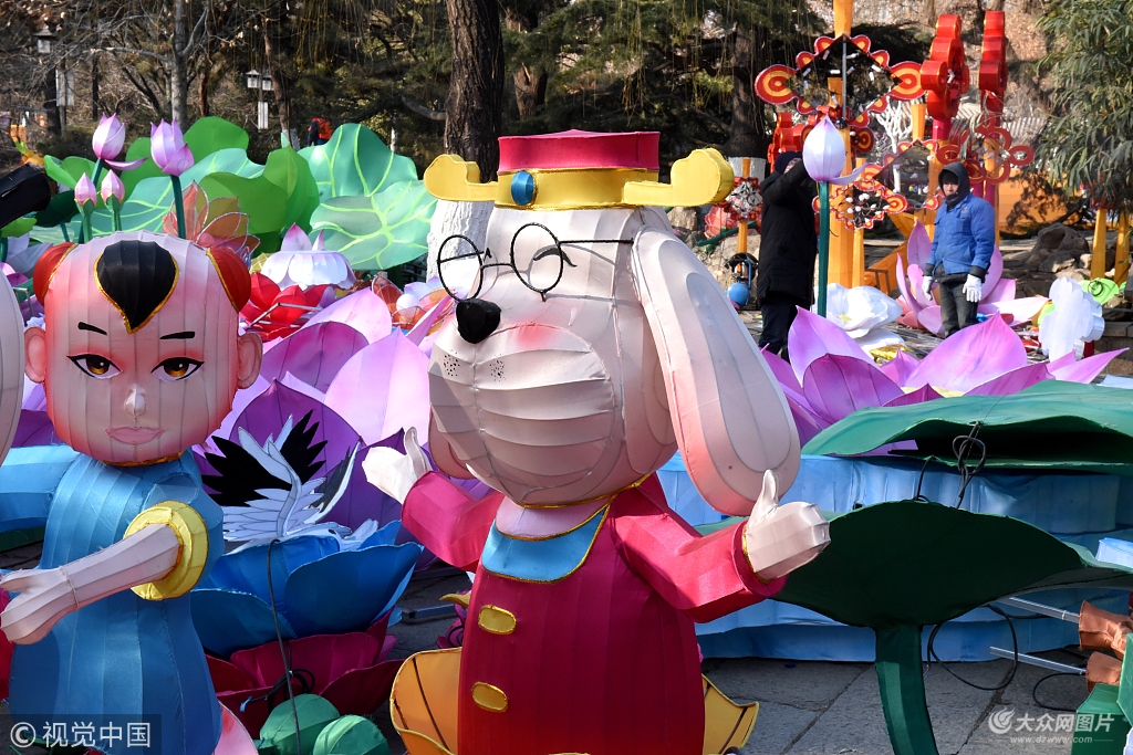 2018年1月23日,濟南趵突泉景區內,各種卡通萌狗造型的花燈成為本屆花燈會的亮點,吸引了許多游客的目光。
