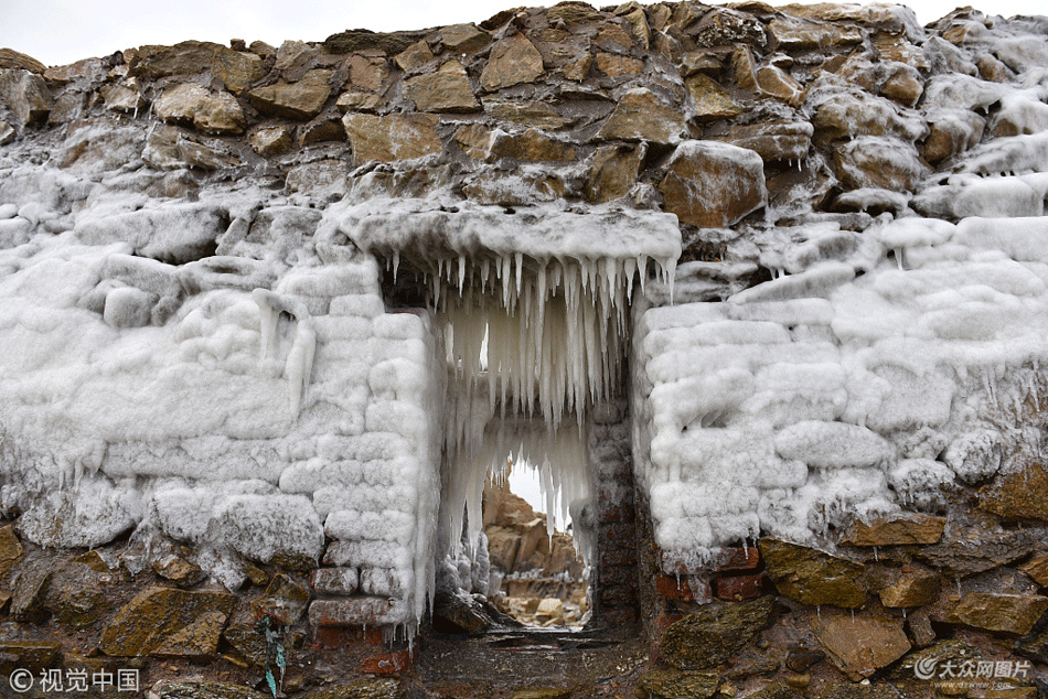 2018年1月27日,山東省日照市山海天旅游度假區任家臺村礁石公園,海邊的天然礁石上布滿了一層白色的海冰。連續多日的低溫,致使海水結冰,附在礁石上,晶瑩剔透,遠遠看去,猶如一片片“玉石”。
