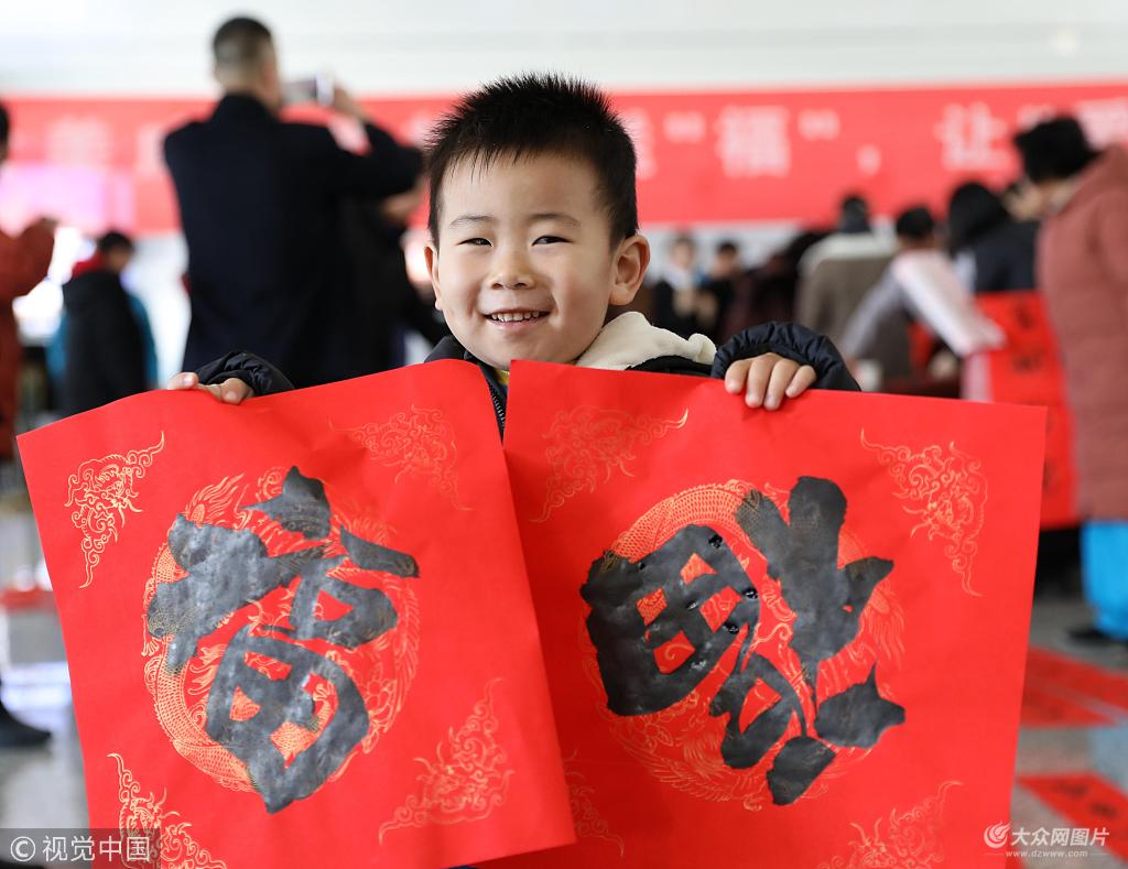 2018年2月1日,在山東省威海火車站候車大廳,小萌娃高興地展示剛拿到的福字。當日,威海市書法家志愿者走進威海火車站,為旅客書寫春聯(lián)、福字,讓愛溫暖旅途。