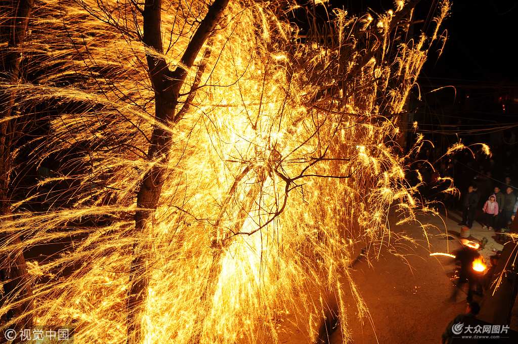 2018年2月24日,山東濟寧,在鄒城市大束鎮北葛村,打鐵花隆重上演。因部分村民節后進城工作,該村決定一年一度的打鐵花改在初九初十兩天天黑時舉行。72歲的孔令法和47歲的孔零雙是在2015年被鄒城市非遺保護中心發現并選為傳承人。自明代起此地涌現出冶鐵名匠,葛爐山的打鐵花表演從明代一直延續至今。