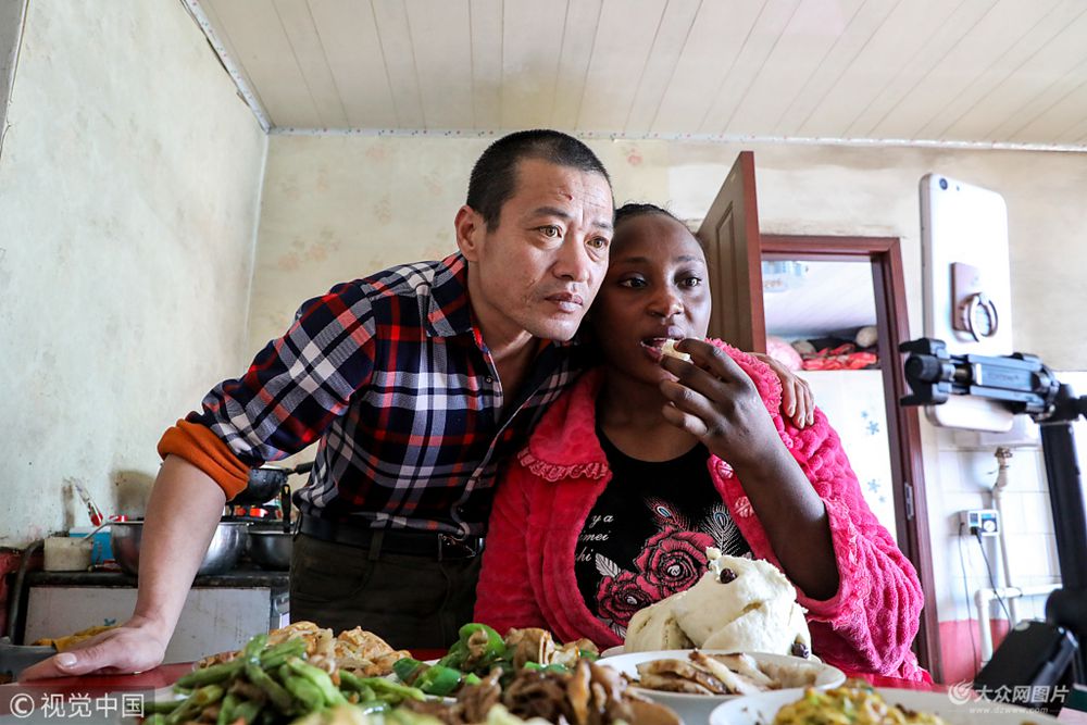 遼寧丹東,43歲的鄒遷順把27歲的喀麥隆女孩桑德拉娶了回來,引起了村里人強烈的好奇,而網友更是在網絡直播平臺發出各式各樣的質疑:16歲的年齡差距、跨國婚姻,是不是真愛?圖為3月6日,馬家店鎮三家子,鄒遷順和妻子桑德拉正通過某網絡直播平臺一一回答網友提問。