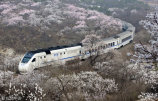 北京居庸關花海迎觀賞高峰 列車穿行其中