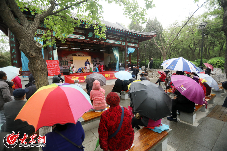 大眾網濟南4月13日訊 一年一度的千佛山“三月三”民俗文化廟會今天拉開帷幕,雖然廟會首日迎來了降溫和陰雨天氣,但豐富的美食和多樣的文化產品仍吸引來不少游客,更有很多市民打著雨傘來為廟會上的戲曲演出捧場。(大眾網、山東24小時記者 亓翔)