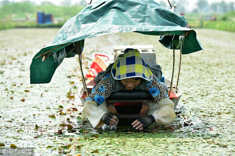 大眾網4月29日訊 杭州,雙浦鎮銅鑒湖村村民正在采收西湖莼菜。在一片片小水塘里,村民們個個趴在一條簡易小船上采收。她們一般從早上5點左右出門,晚上6點左右回家,天天十多個小時趴在一條小船上不停采收,很多時候就啃點干糧當中飯。據了解,采收的西湖莼菜可以賣到每斤10元,有的村民將它賣到杭城一些大酒店,有的則賣給專門的收購點出口海外。西湖莼菜羹,是錢塘十大名菜之一。但采收西湖莼菜絕對是個體力活,勞作艱辛。