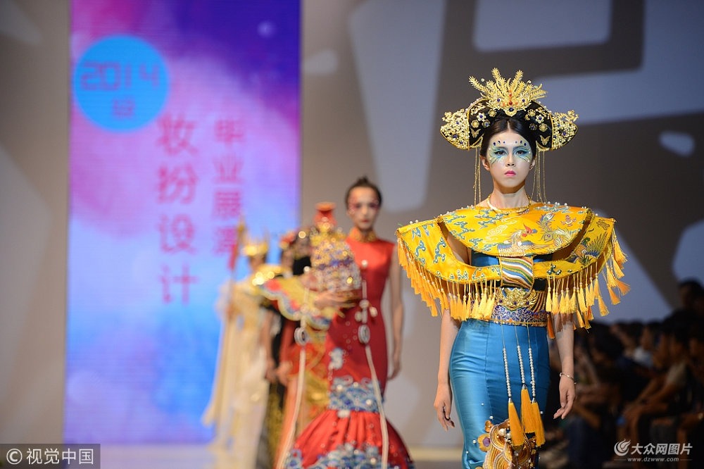2018年5月17日,山東省濟南市,山東工藝美術(shù)學院2018年畢業(yè)展服裝秀在舜耕國際會展中心隆重拉開帷幕,身材高挑的模特身穿2014屆畢業(yè)生設(shè)計的各式服裝在T臺上走秀。其中,古裝展示部分大玩穿越,各路神仙輪番出場,令觀眾大呼過癮。