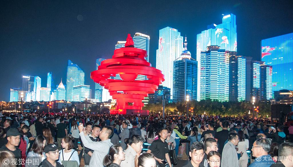 2018年5月23日,山東青島,五四廣場(chǎng),上合峰會(huì)召開(kāi)在即,浮山灣海岸近的媒體建筑立面,流光溢彩的燈光勾勒出青島蜿蜒曲折的海岸線,讓游人在光影互動(dòng)中感受青島的浪漫與華麗。位于燈光秀核心區(qū)域的五四廣場(chǎng)附近,更是人潮涌動(dòng),吸引了大量市民和游客前來(lái)一飽眼福,欣賞美麗的夜景,拍照留念。