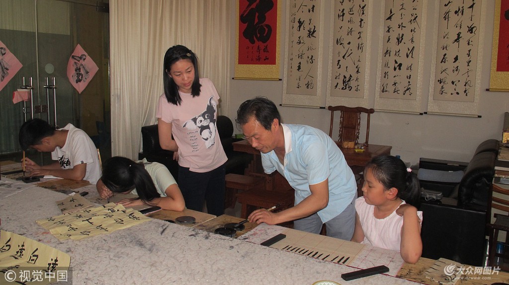 2018年6月3日,在山東省日照市莒縣文街的二層樓上,失去右臂的仕金正正在耐心的輔導孩子們練習書法。
