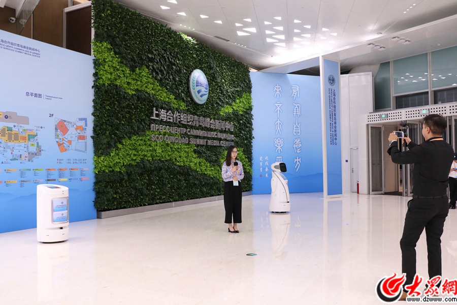 大眾網青島6月6日訊(特派記者 王磊)6日上午8點,上海合作組織青島峰會新聞中心正式開放,截至當天下午16時,已有860余名中外記者進入新聞中心工作。在新聞中心門口,迎賓機器人“六六”成為眾多媒體關注的焦點。