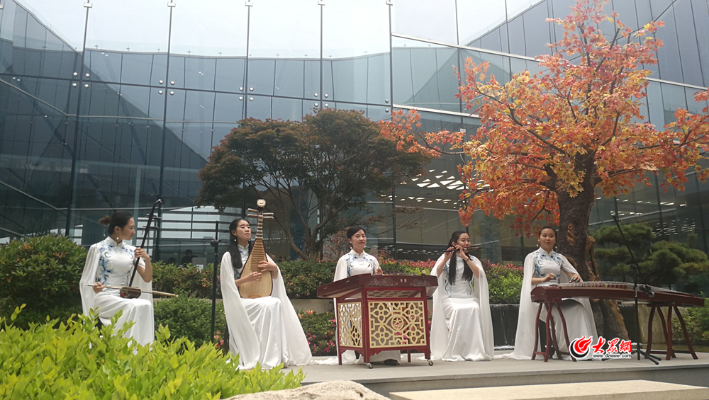 在新聞中心一樓,身著白色長裙的表演者現場演奏《茉莉花》《喜洋洋》《采茶燈》樂曲。