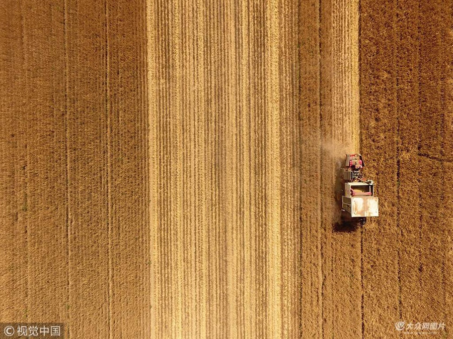 2018年6月5日, 收割機在山東省聊城市茌平縣賈寨鎮侯樓村田間收割小麥。